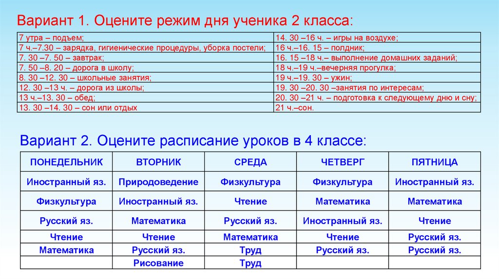 Вариант 1. Оцените режим дня ученика 2 класса:7 утра – подъем;