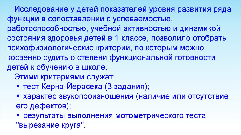 Исследование у детей показателей уровня развития рядафункции в сопоставлении с успеваемостью,