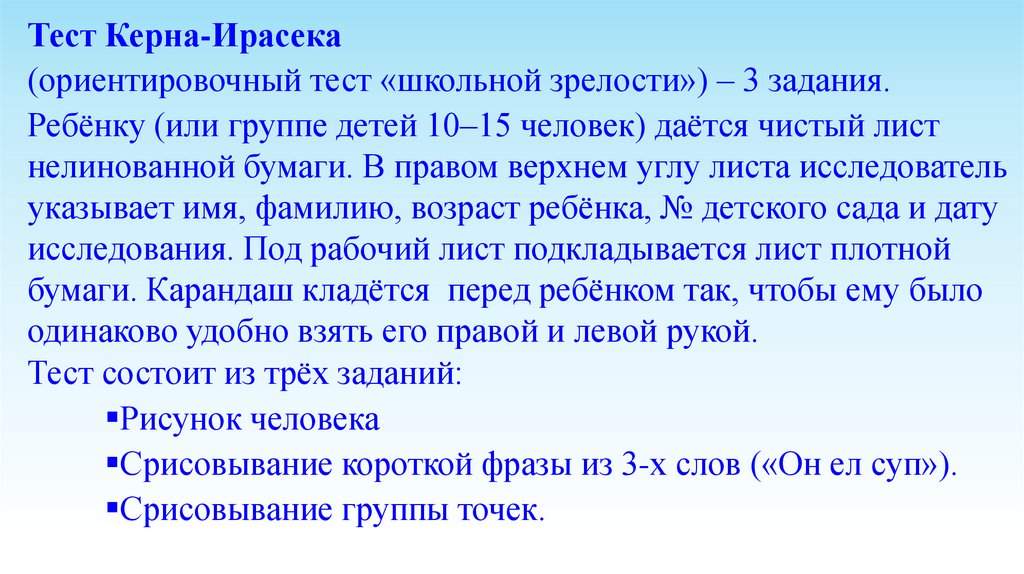 Тест Керна-Ирасека(ориентировочный тест «школьной зрелости») – 3 задания.