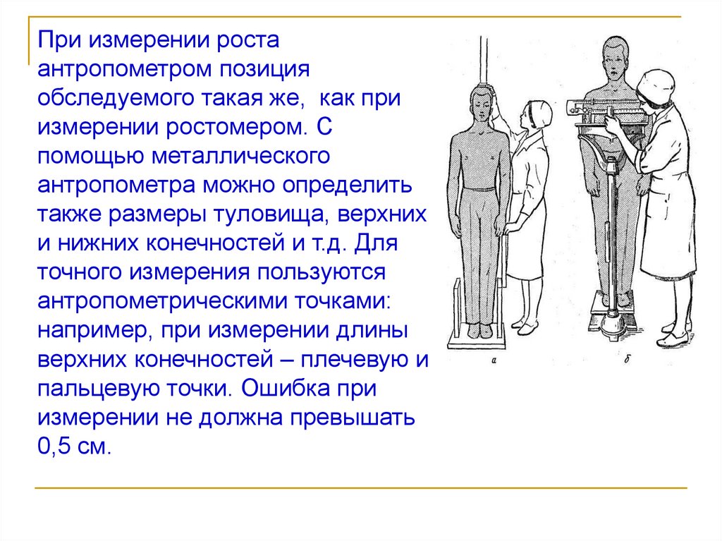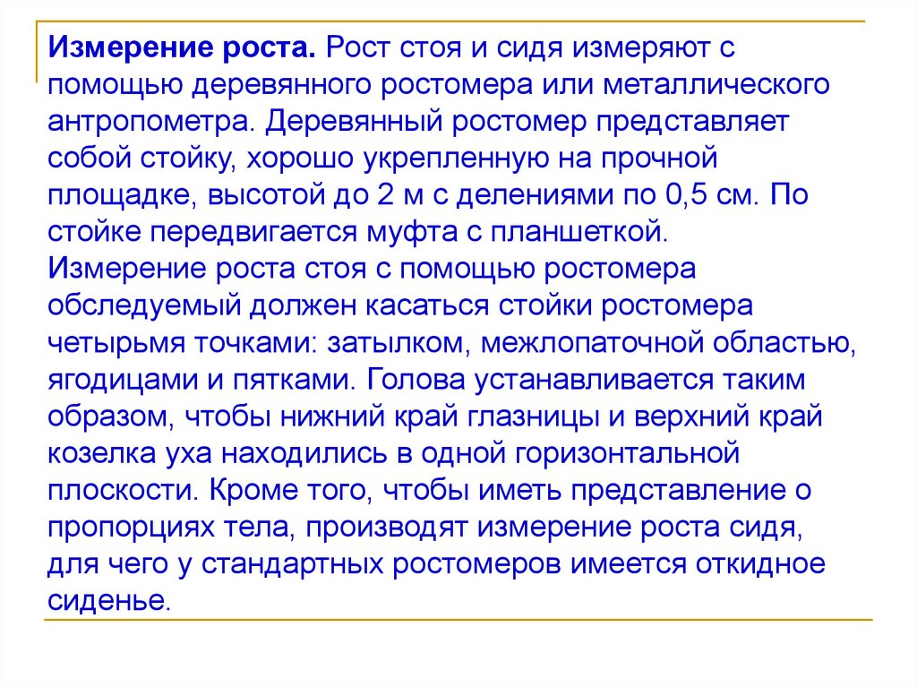Измерение роста. Рост стоя и сидя измеряют спомощью деревянного ростомера или металлического