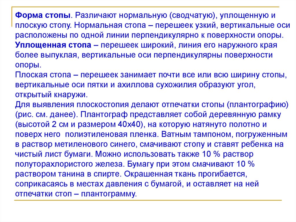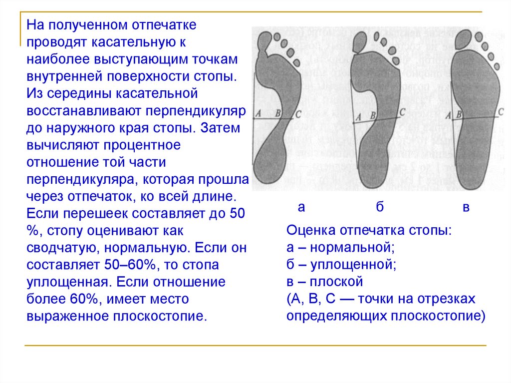 Форма стопы. Различают нормальную (сводчатую), уплощенную иплоскую стопу. Нормальная стопа – перешеек узкий, вертикальные оси