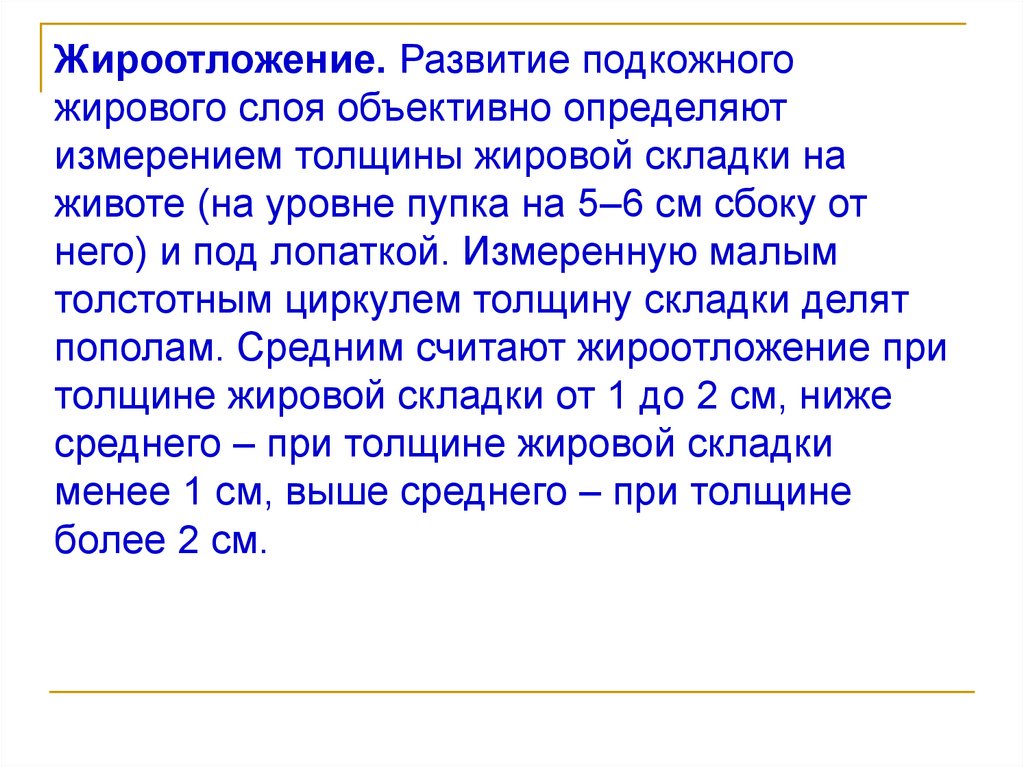 Жироотложение. Развитие подкожногожирового слоя объективно определяют