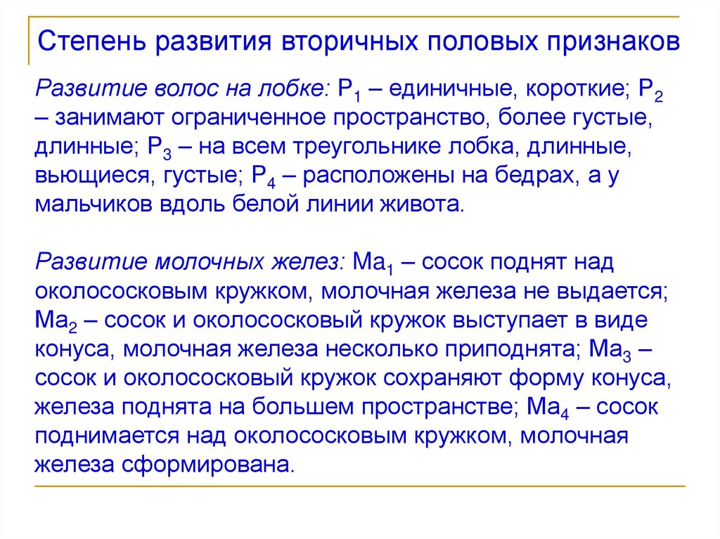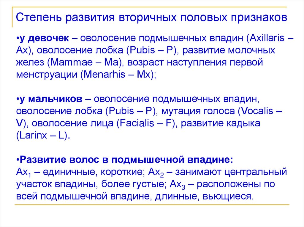 Ax), оволосение лобка (Pubis – Р), развитие молочных