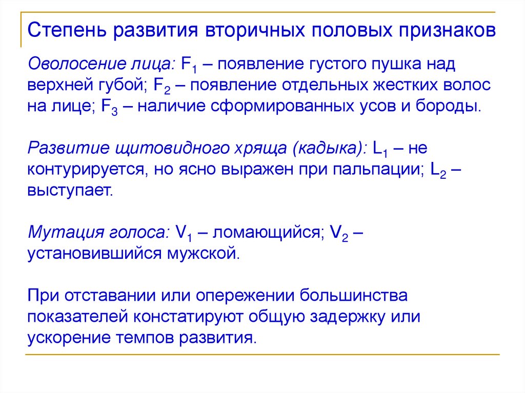 оволосение лобка (Pubis – Р), мутация голоса (Vocalis –
