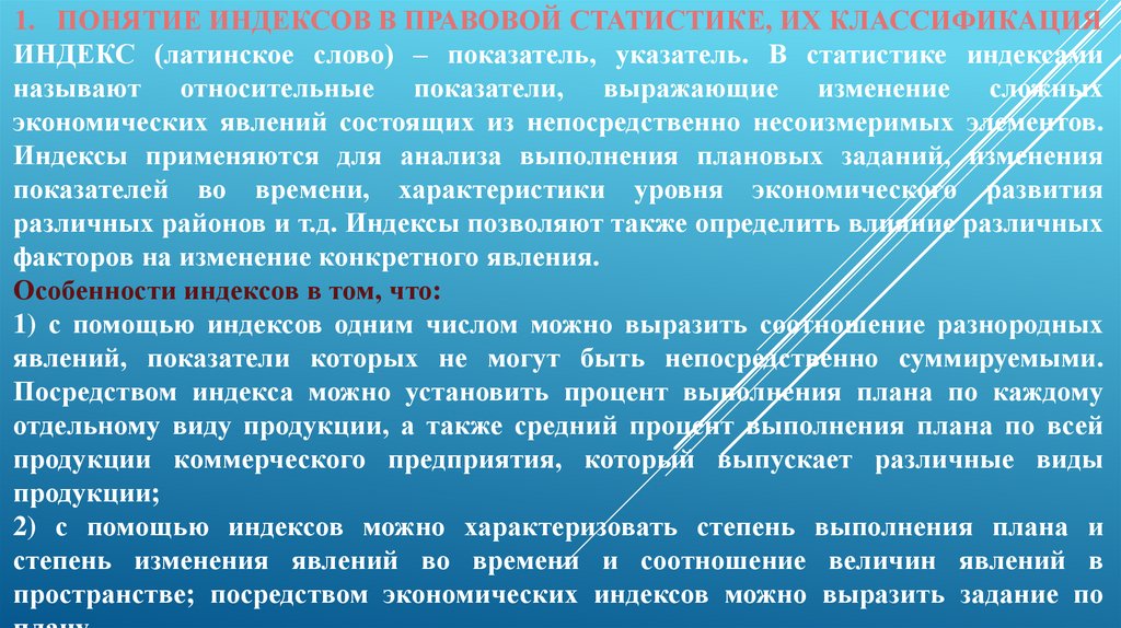 1. ПОНЯТИЕ ИНДЕКСОВ В ПРАВОВОЙ СТАТИСТИКЕ, ИХ КЛАССИФИКАЦИЯИНДЕКС (латинское слово) – показатель, указатель. В статистике индексами