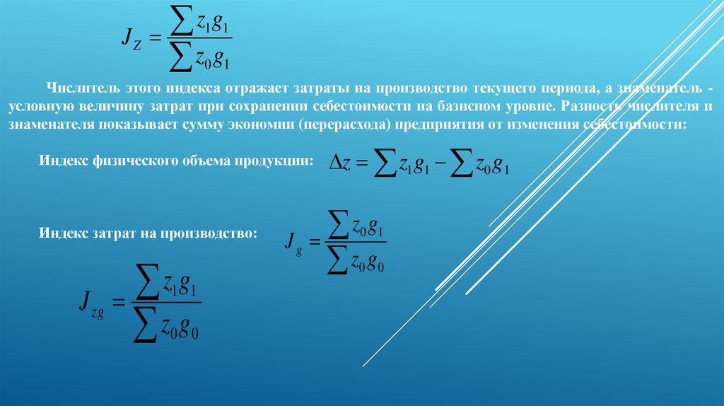 Числитель этого индекса отражает затраты на производство текущего периода, а знаменатель условную величину затрат при сохранении себестоимости на базисном уровне. Разность числителя и