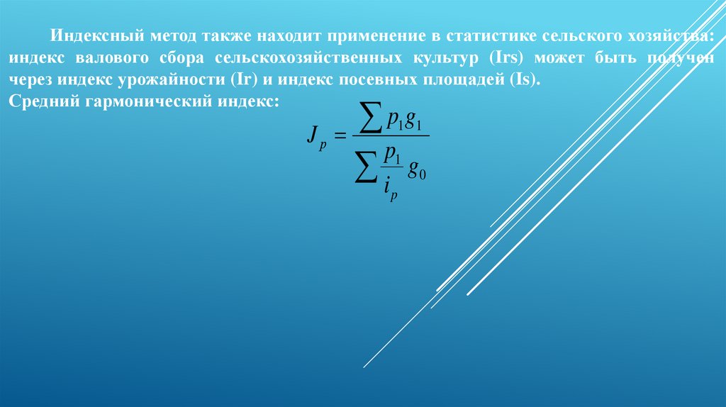 Индексный метод также находит применение в статистике сельского хозяйства:индекс валового сбора сельскохозяйственных культур (Irs) может быть получен