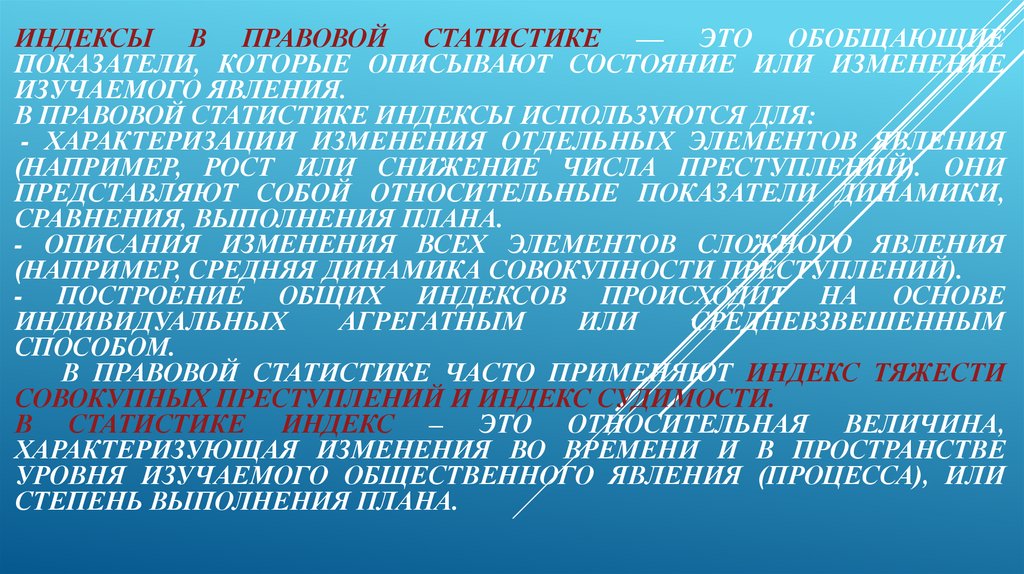 ИНДЕКСЫ В ПРАВОВОЙ СТАТИСТИКЕ — ЭТО ОБОБЩАЮЩИЕПОКАЗАТЕЛИ, КОТОРЫЕ ОПИСЫВАЮТ СОСТОЯНИЕ ИЛИ ИЗМЕНЕНИЕ