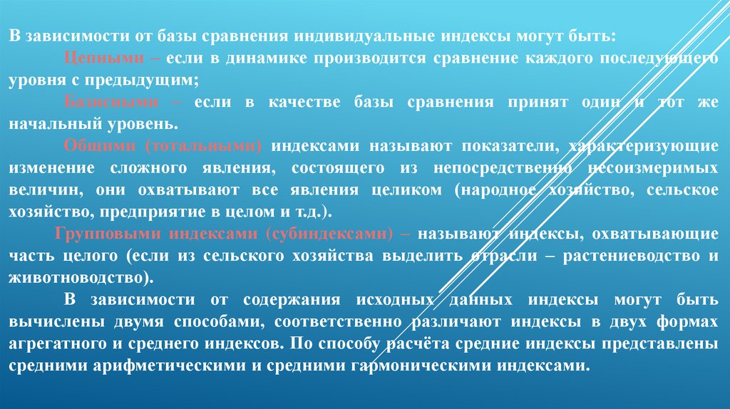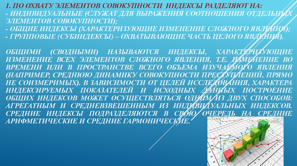 1. ПО ОХВАТУ ЭЛЕМЕНТОВ СОВОКУПНОСТИ ИНДЕКСЫ РАЗДЕЛЯЮТ НА:- ИНДИВИДУАЛЬНЫЕ (СЛУЖАТ ДЛЯ ВЫРАЖЕНИЯ СООТНОШЕНИЯ ОТДЕЛЬНЫХ