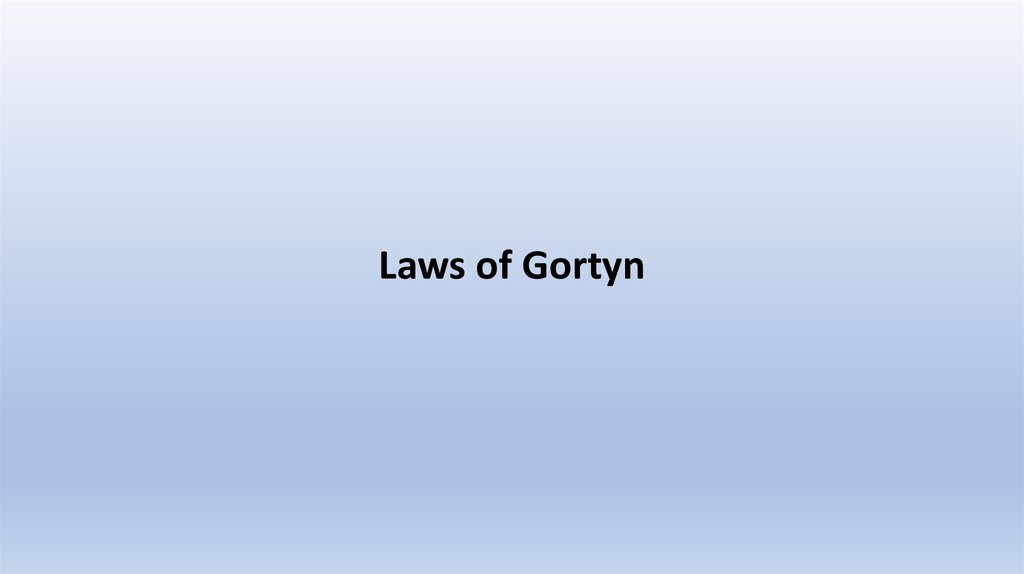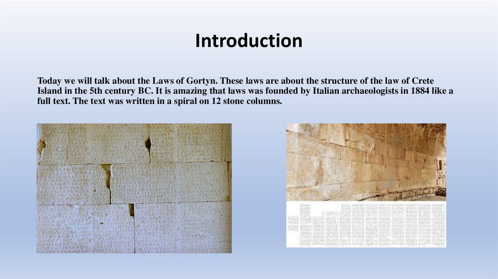 Today we will talk about the Laws of Gortyn. These laws are about the structure of the law of CreteIsland in the 5th century BC. It is amazing that laws was founded by Italian archaeologists in 1884 like a