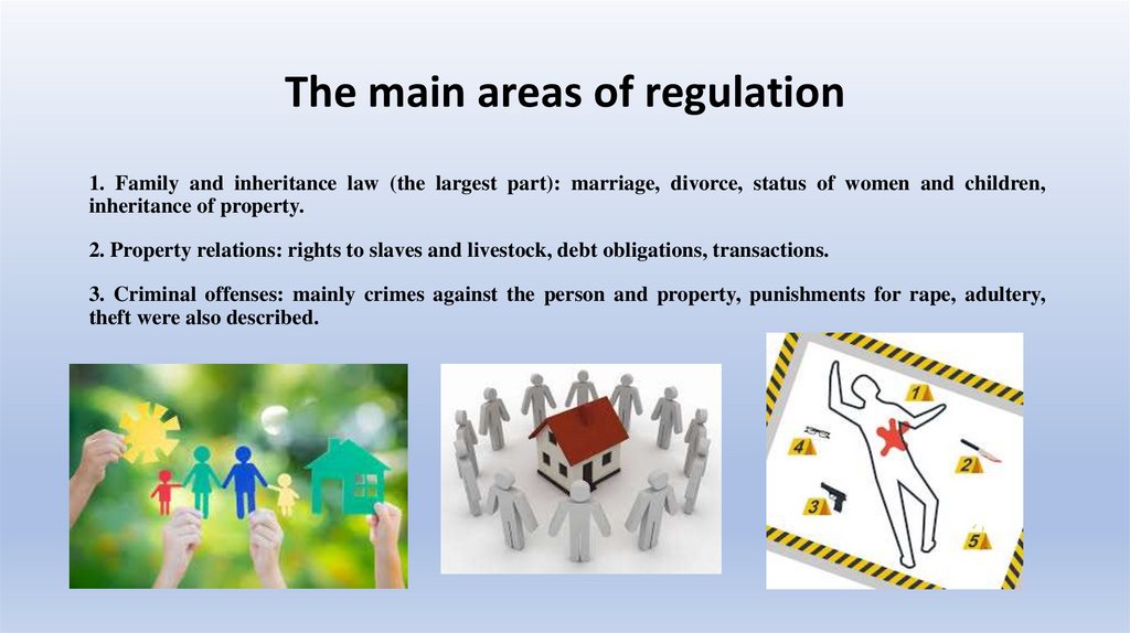 3. Criminal offenses: mainly crimes against the person and property, punishments for rape, adultery,