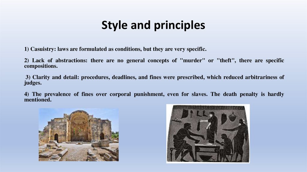1) Casuistry: laws are formulated as conditions, but they are very specific.2) Lack of abstractions: there are no general concepts of "murder" or "theft", there are specific