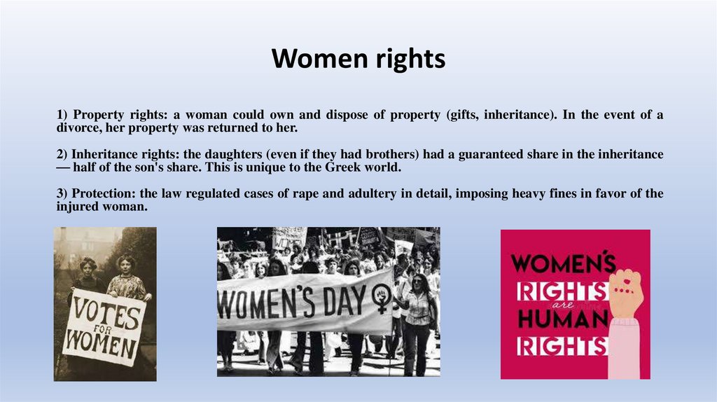1) Property rights: a woman could own and dispose of property (gifts, inheritance). In the event of adivorce, her property was returned to her.