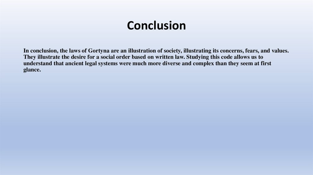 In conclusion, the laws of Gortyna are an illustration of society, illustrating its concerns, fears, and values.They illustrate the desire for a social order based on written law. Studying this code allows us to