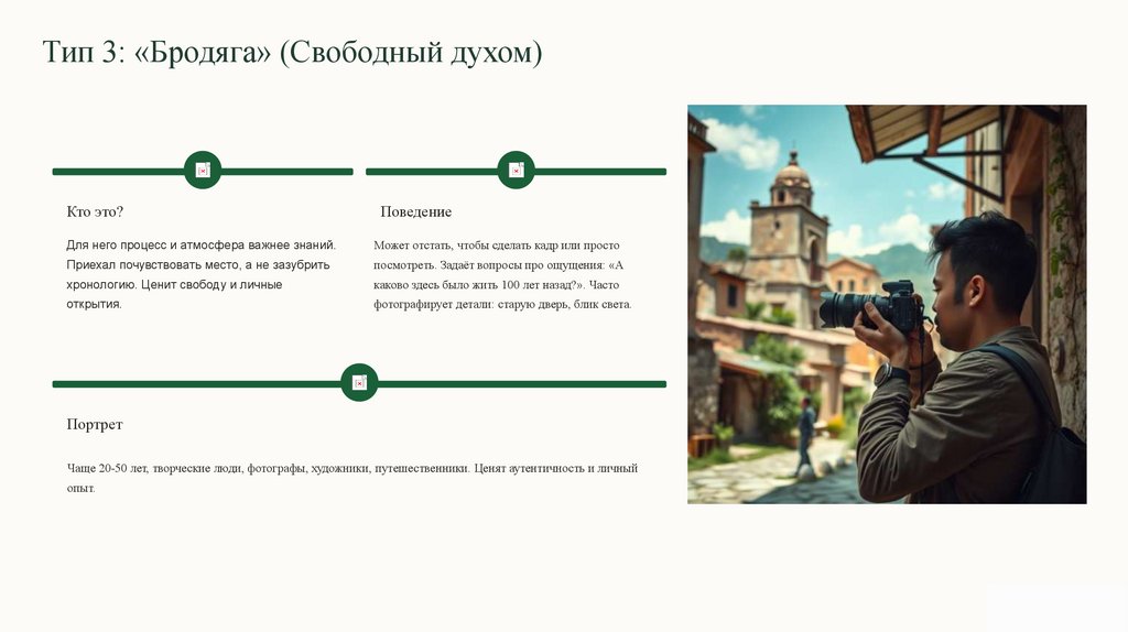 Чаще 20-50 лет, творческие люди, фотографы, художники, путешественники. Ценят аутентичность и личный
