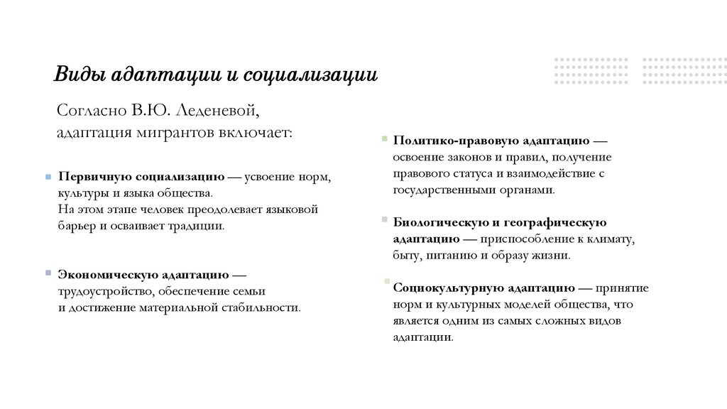 Виды адаптации и социализацииСогласно В.Ю. Леденевой,