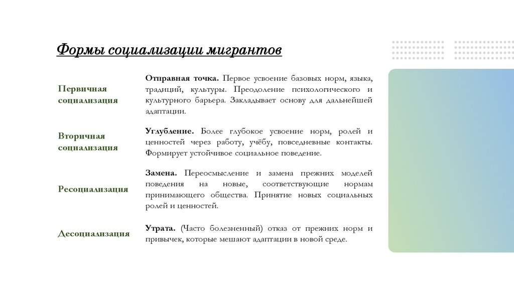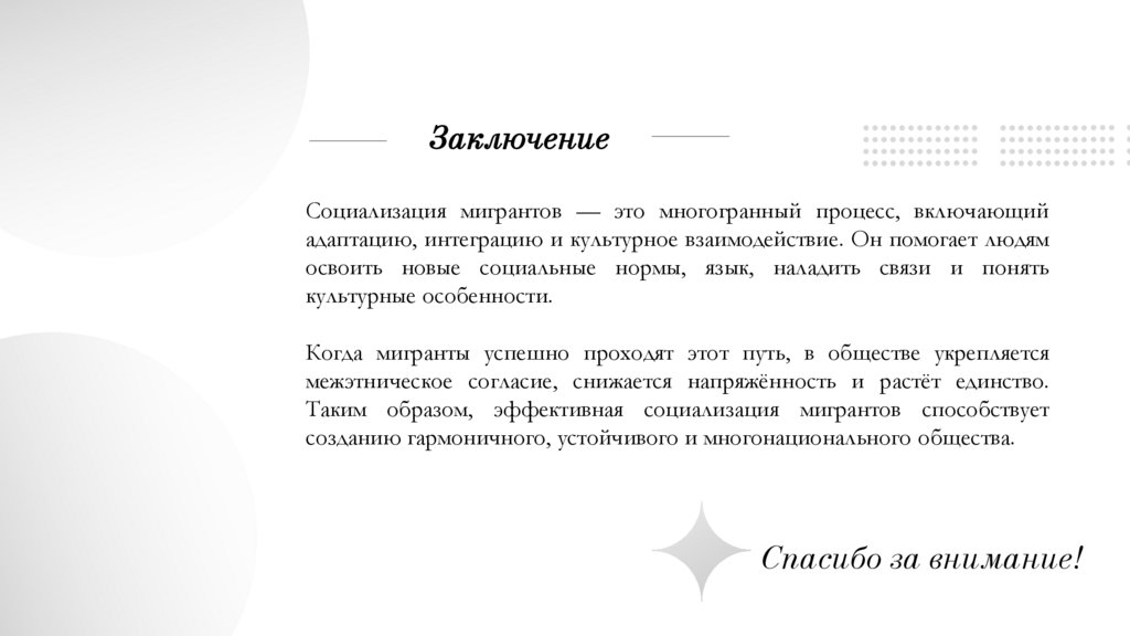 ЗаключениеСоциализация мигрантов — это многогранный процесс, включающий