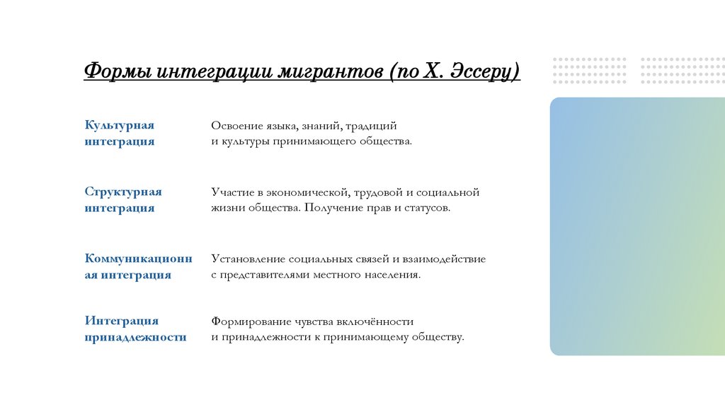 Формы интеграции мигрантов (по Х. Эссеру)Культурная