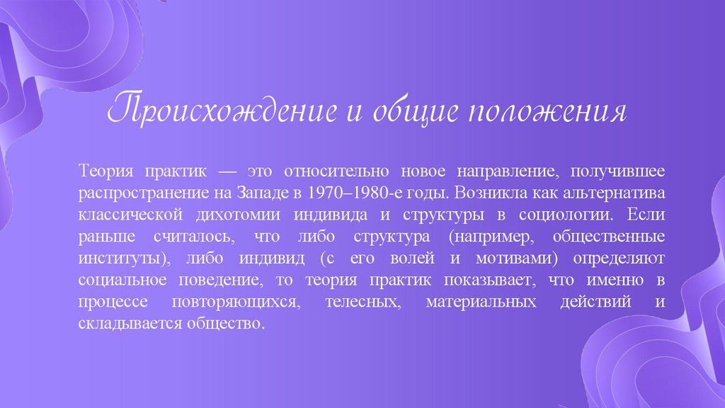 Происхождение и общие положенияТеория практик — это относительно новое направление, получившее