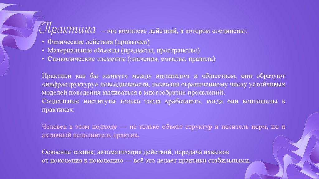 Практики как бы «живут» между индивидом и обществом, они образуют