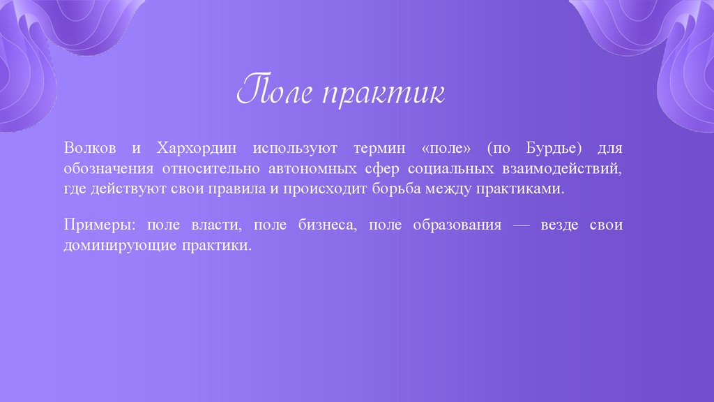 Поле практикВолков и Хархордин используют термин «поле» (по Бурдье) для