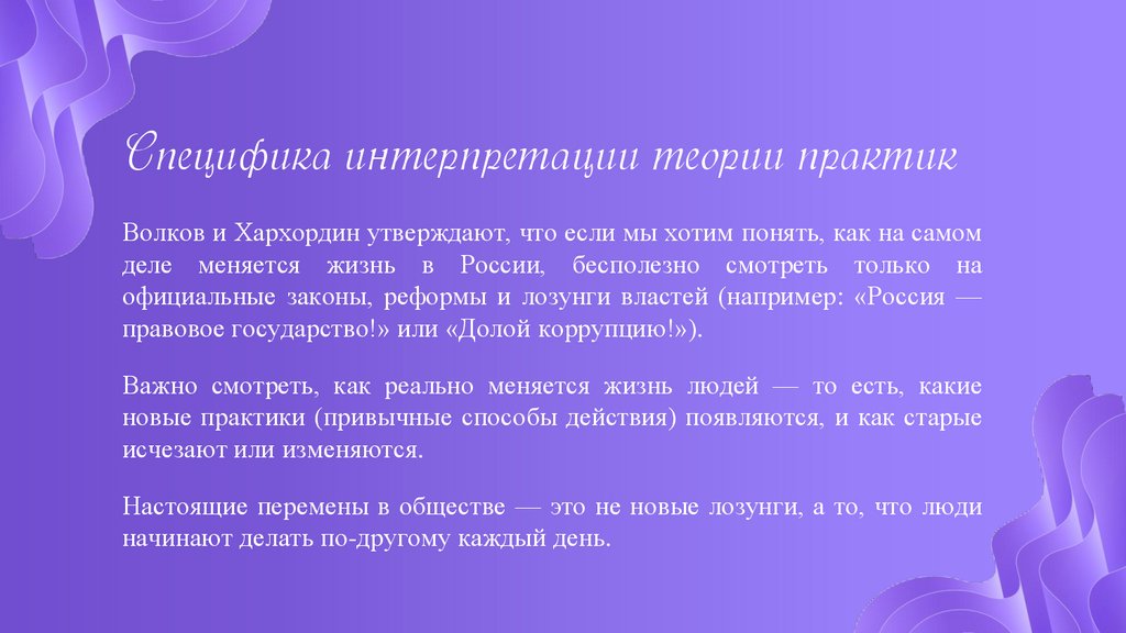 Специфика интерпретации теории практикВолков и Хархордин утверждают, что если мы хотим понять, как на самом