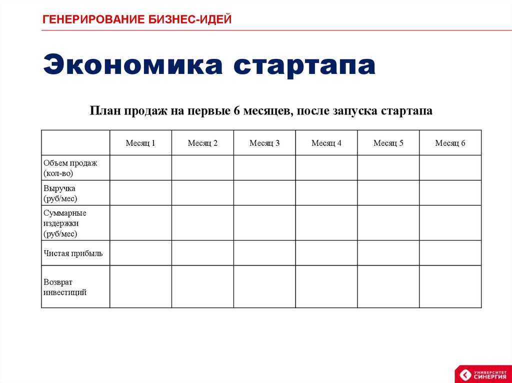 План продаж на первые 6 месяцев, после запуска стартапа