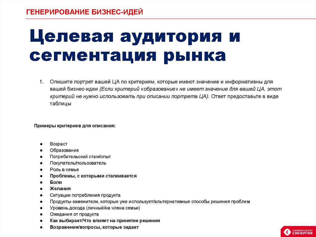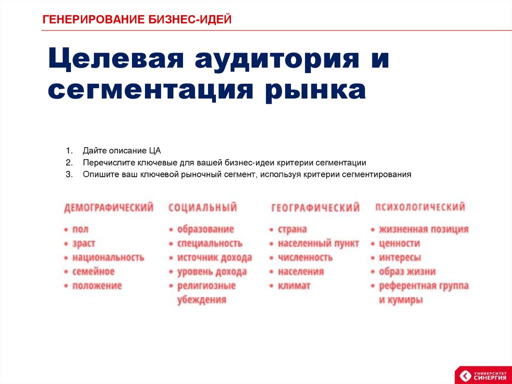 ГЕНЕРИРОВАНИЕ БИЗНЕС-ИДЕЙЦелевая аудитория и