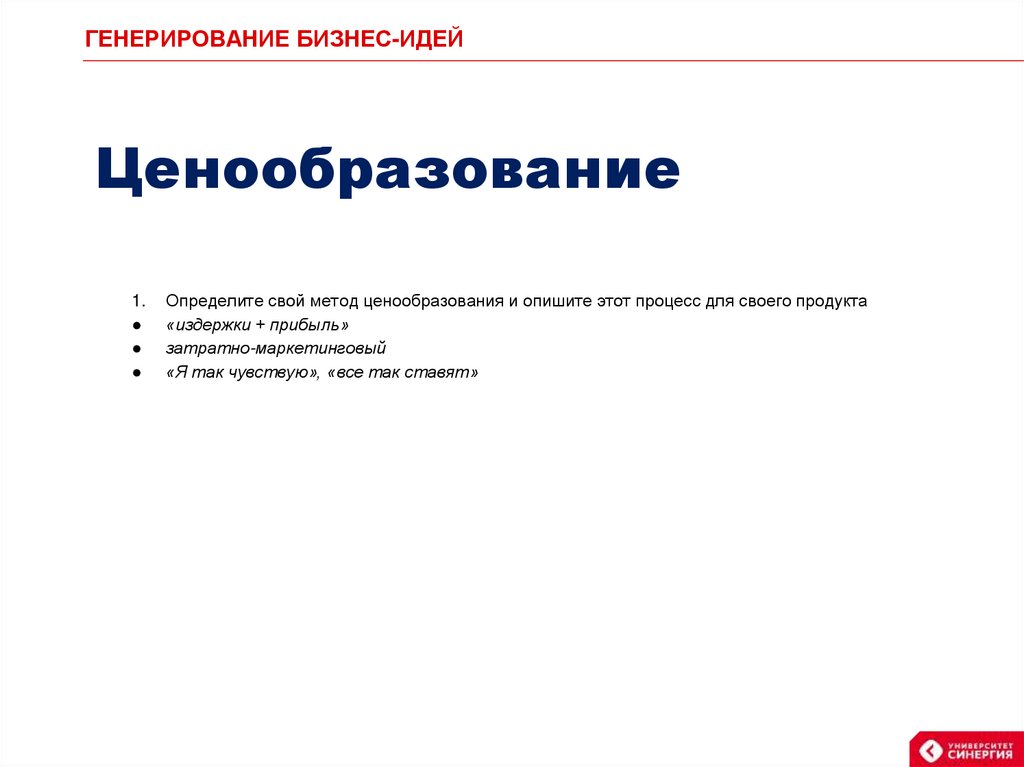 ГЕНЕРИРОВАНИЕ БИЗНЕС-ИДЕЙЦенообразование