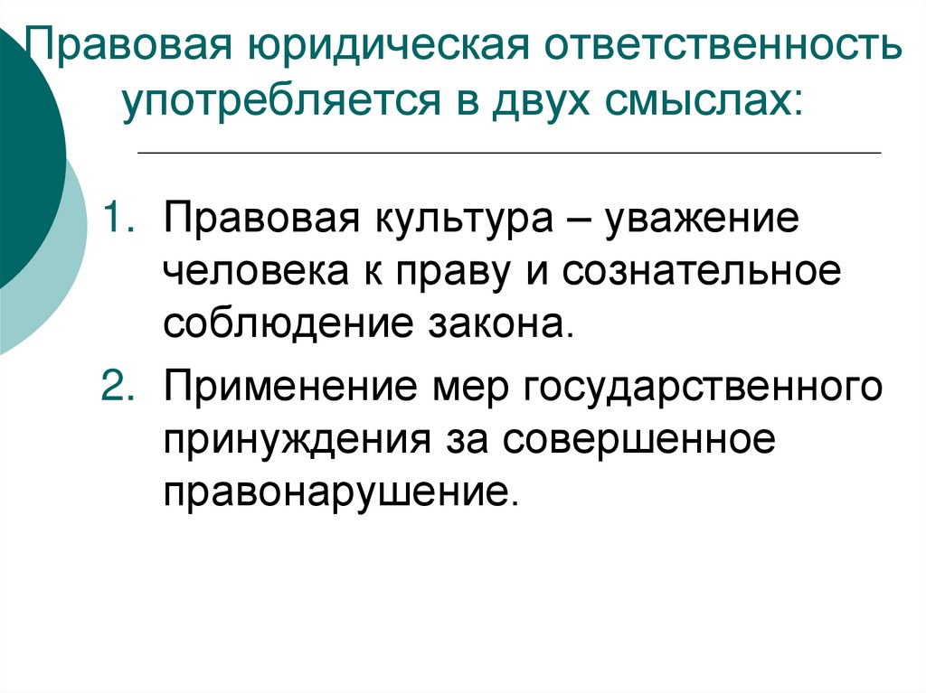 12. Правовая юридическая ответственность употребляется в двух смыслах: