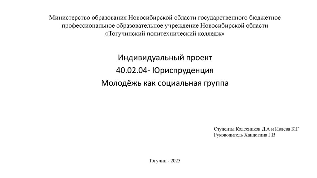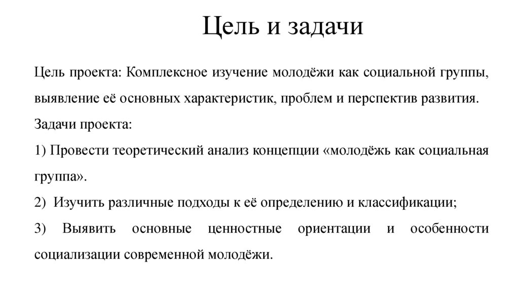 Цель и задачиЦель проекта: Комплексное изучение молодёжи как социальной группы,