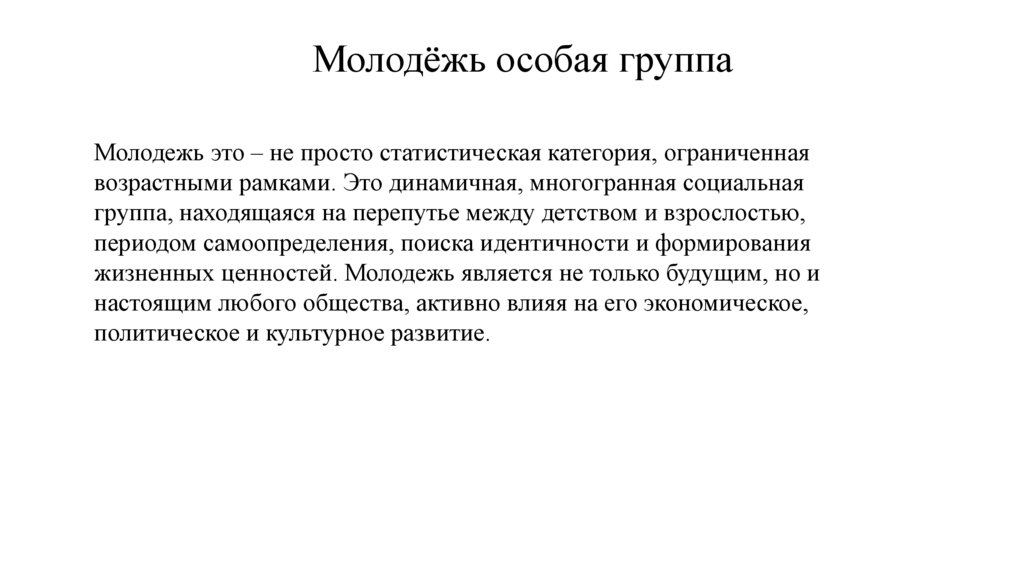 Молодежь это – не просто статистическая категория, ограниченнаявозрастными рамками. Это динамичная, многогранная социальная