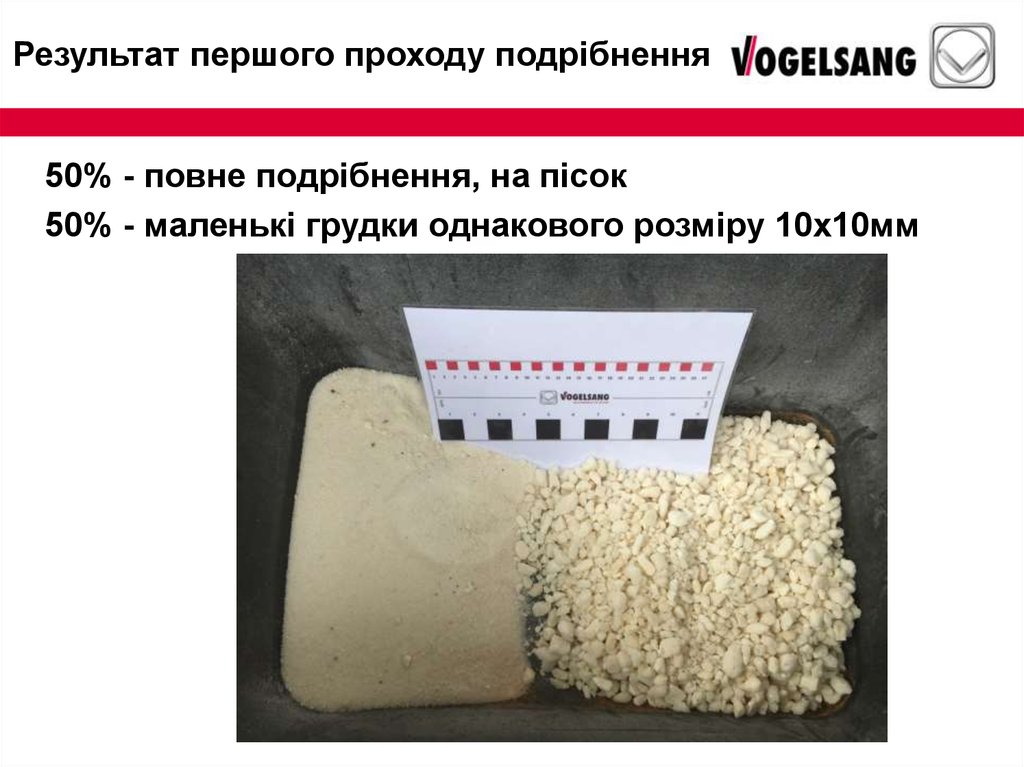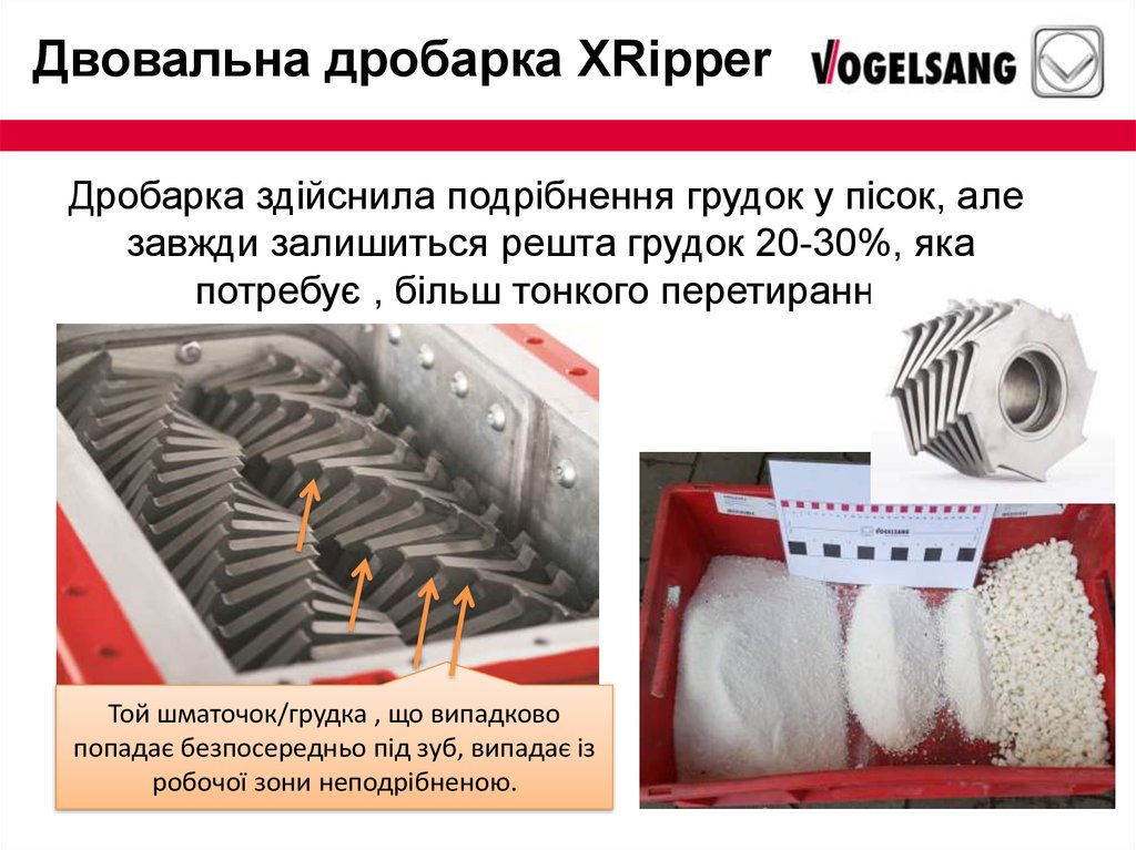 Двовальна дробарка XRipperДробарка здійснила подрібнення грудок у пісок, але