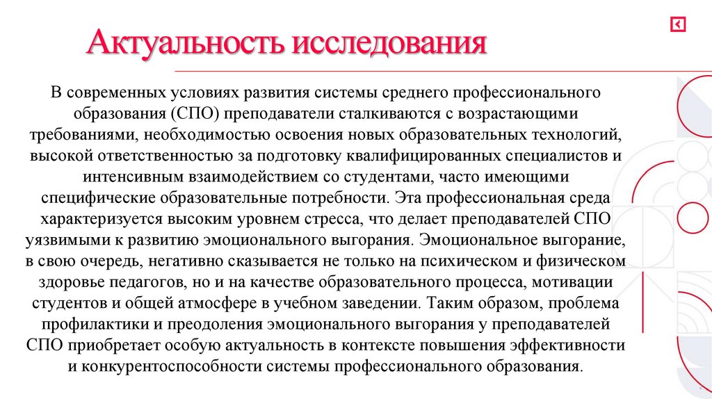 Актуальность исследованияВ современных условиях развития системы среднего профессионального