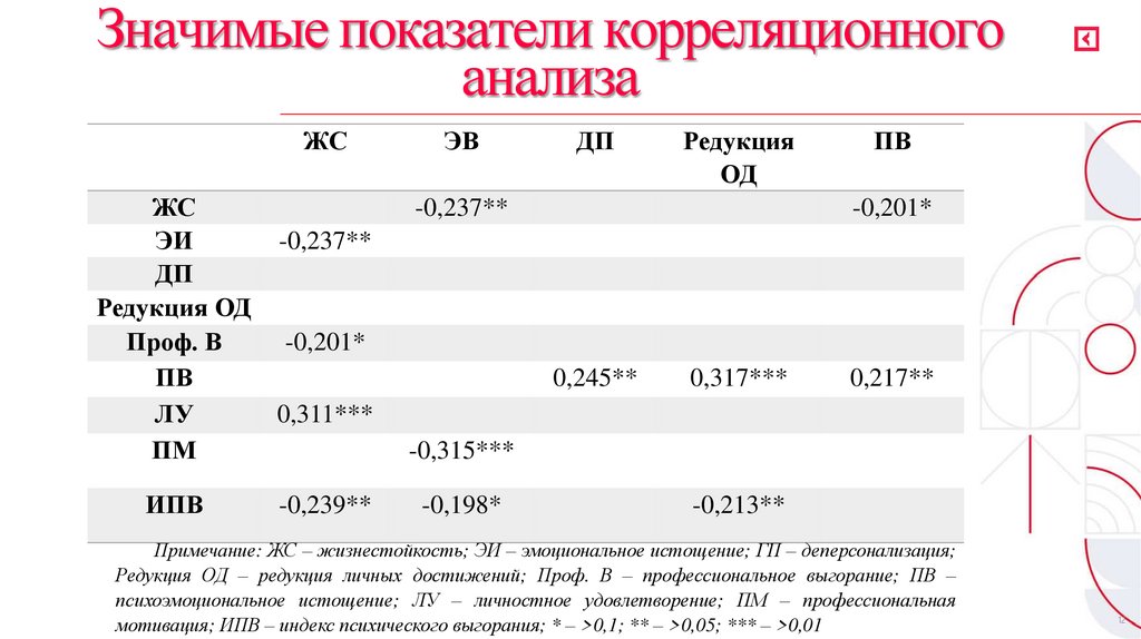 Редукция ОД – редукция личных достижений; Проф. В – профессиональное выгорание; ПВ –