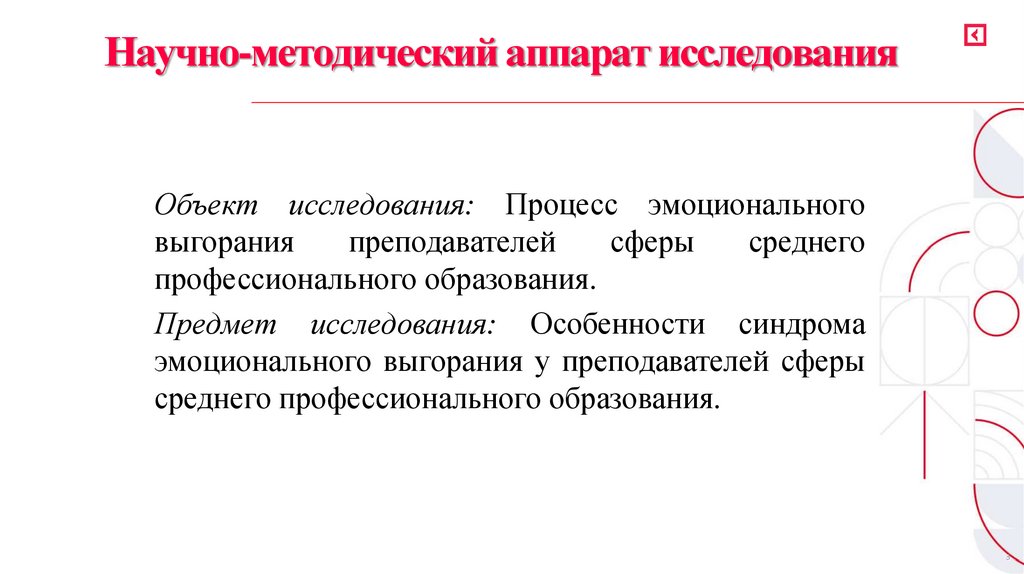 Научно-методический аппарат исследованияОбъект исследования: Процесс эмоционального