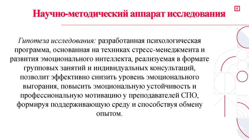 Научно-методический аппарат исследованияГипотеза исследования: разработанная психологическая