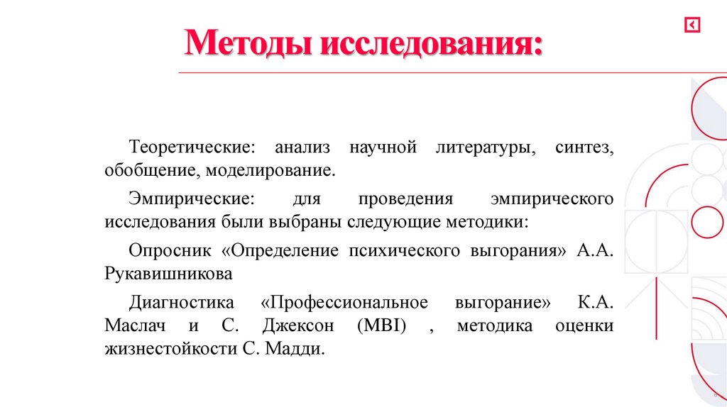 Методы исследования:Теоретические: анализ научной литературы, синтез,