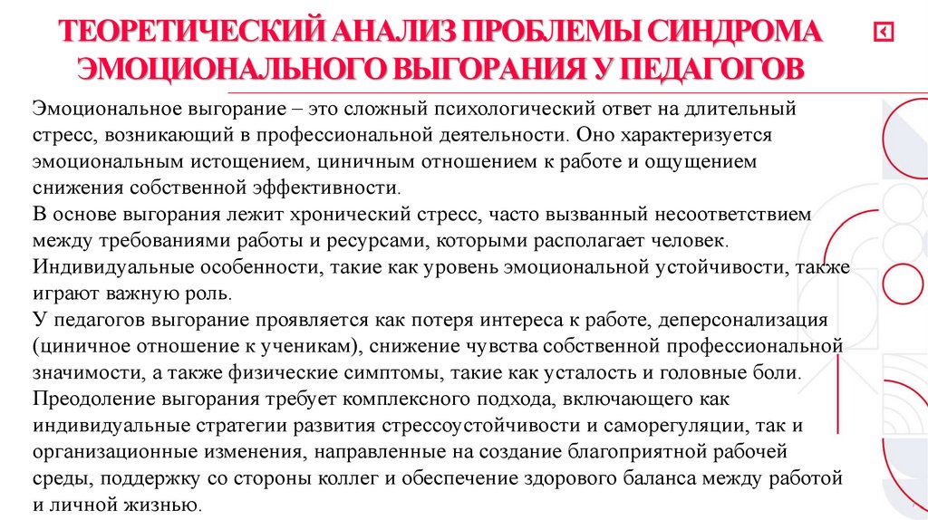 ТЕОРЕТИЧЕСКИЙ АНАЛИЗ ПРОБЛЕМЫ СИНДРОМАЭМОЦИОНАЛЬНОГО ВЫГОРАНИЯ У ПЕДАГОГОВ