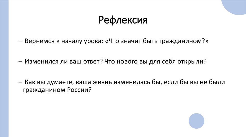 Вернемся к началу урока: «Что значит быть гражданином?»Изменился ли ваш ответ? Что нового вы для себя открыли?