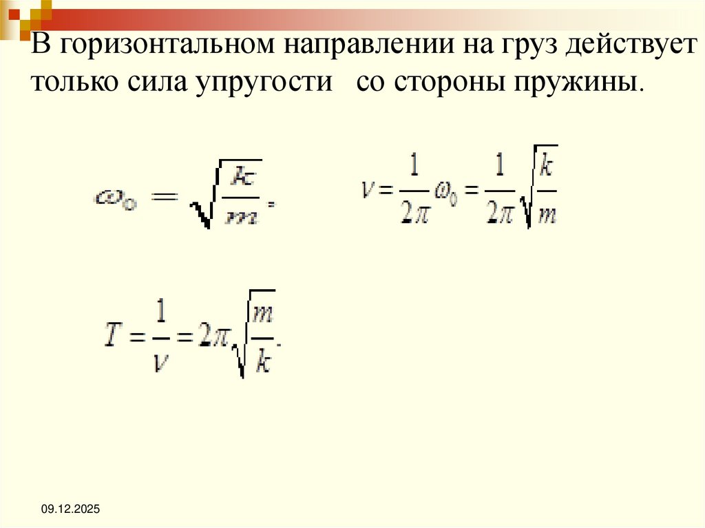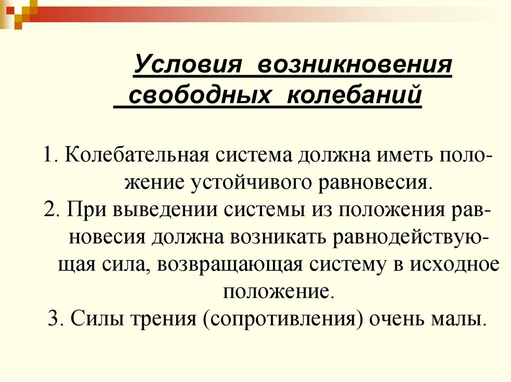 5. Условия возникновения свободных колебаний 1. Колебательная система должна иметь поло- жение устойчивого равновесия. 2. При