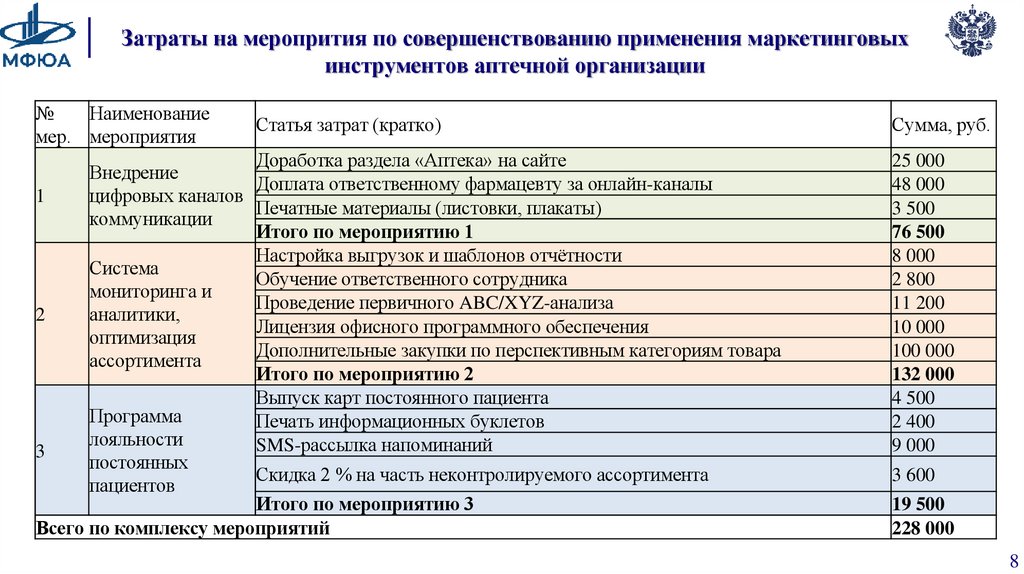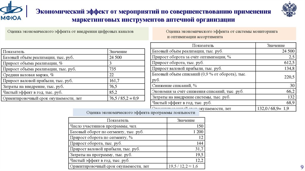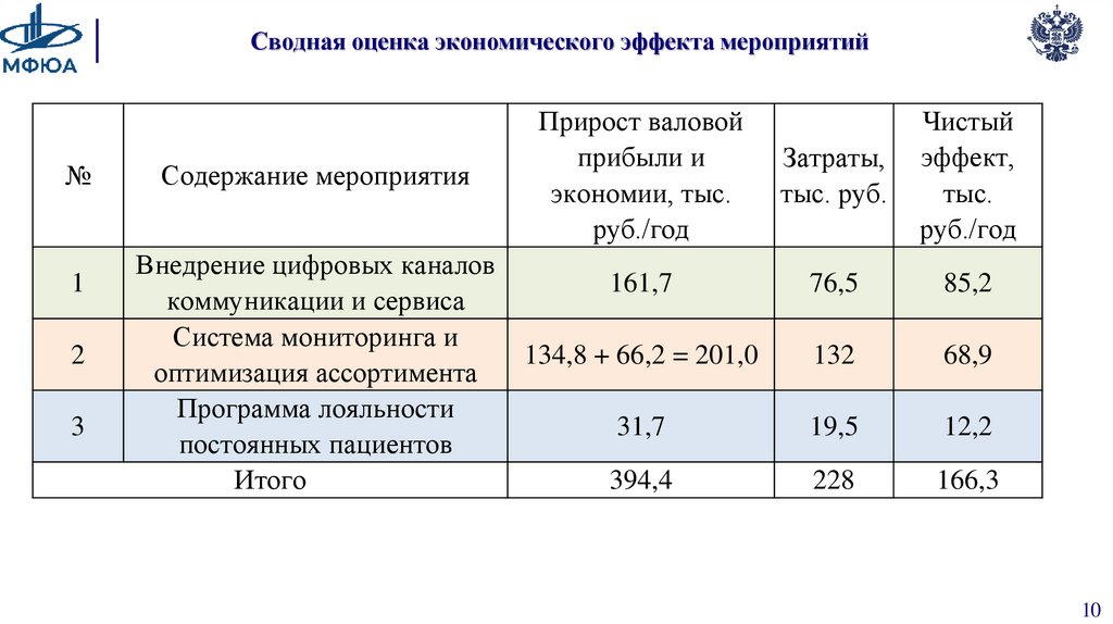 10. Экономический эффект от мероприятий по совершенствованию применения маркетинговых инструментов аптечной организации