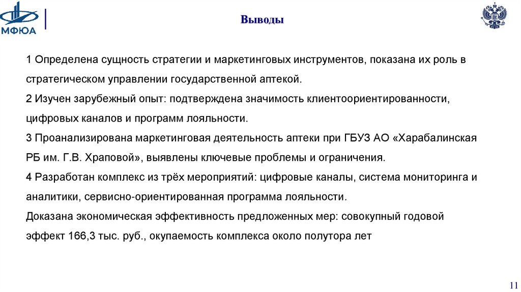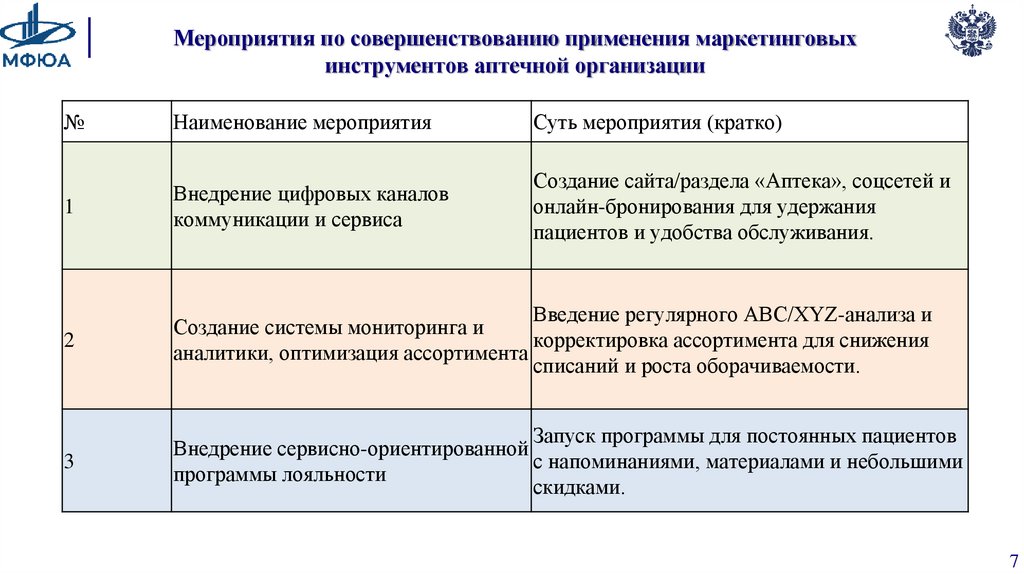 – оценить действующую стратегию развития государственной аптеки и применяемые в её рамках маркетинговые инструменты;