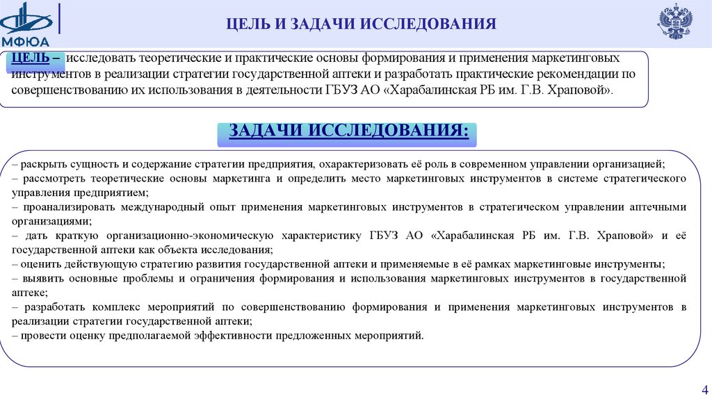 ЦЕЛЬ – исследовать теоретические и практические основы формирования и применения маркетинговыхинструментов в реализации стратегии государственной аптеки и разработать практические рекомендации по