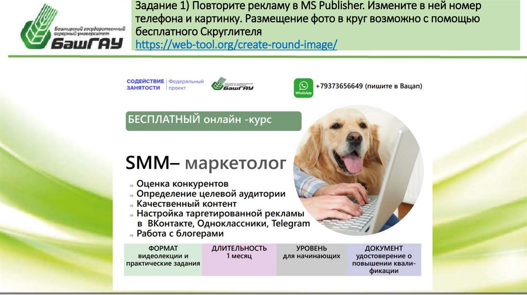 2. Задание 1) Повторите рекламу в MS Publisher. Измените в ней номер телефона и картинку. Размещение фото в круг возможно с