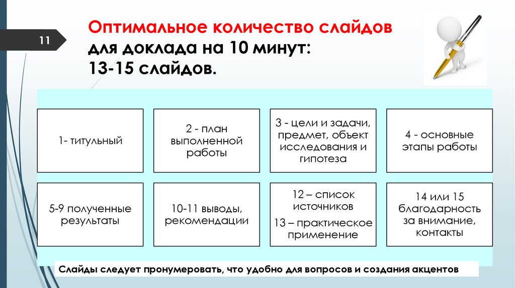Слайды следует пронумеровать, что удобно для вопросов и создания акцентов