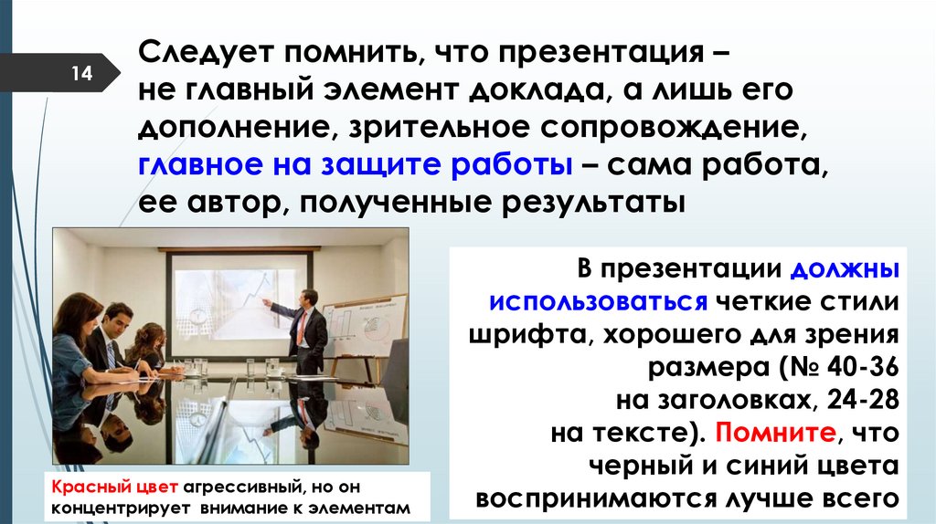 14. Следует помнить, что презентация – не главный элемент доклада, а лишь его дополнение, зрительное сопровождение, главное на