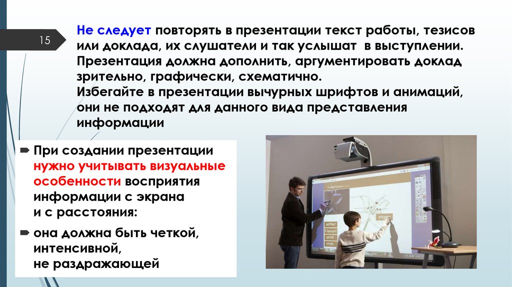 15. Не следует повторять в презентации текст работы, тезисов или доклада, их слушатели и так услышат в выступлении. Презентация