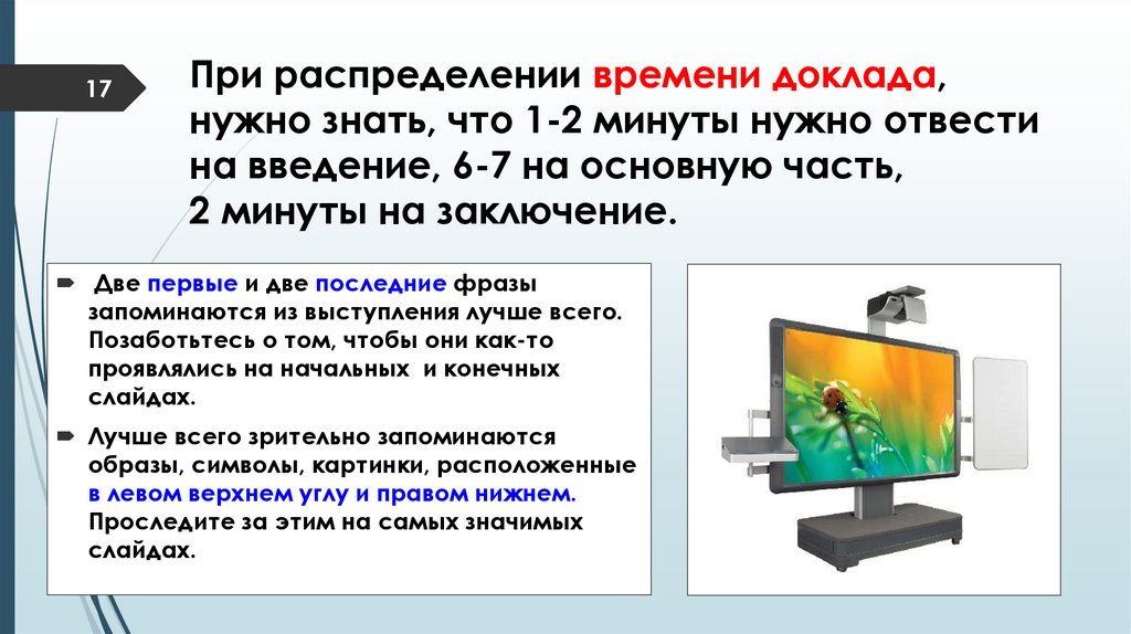17. При распределении времени доклада, нужно знать, что 1-2 минуты нужно отвести на введение, 6-7 на основную часть, 2 минуты на