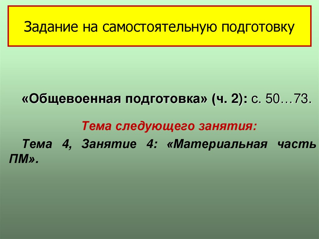 «Общевоенная подготовка» (ч. 2): с. 50…73.Тема следующего занятия: